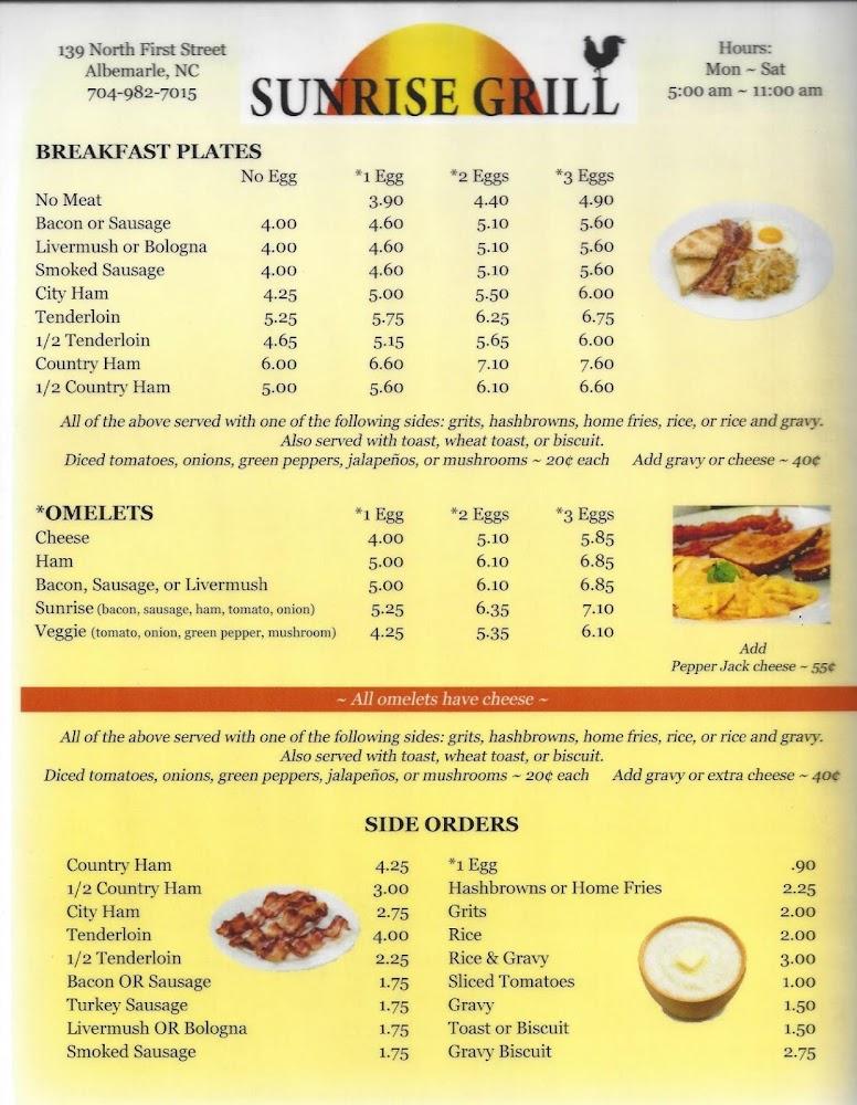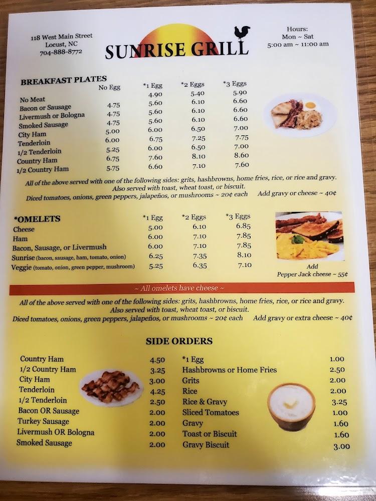 Welcome to Sunrise Grill, your go-to breakfast haven located at 118 W Main St, Locust, NC. Enjoy a relaxed and inviting atmosphere while savoring our excellent coffee and delightful local specialties. Whether you prefer dining in, grabbing a quick bite to-go, or enjoying our convenient drive-thru service, we cater to all tastes with a menu featuring healthy options and traditional favorites. Sunrise Grill is perfect for solo diners, families, and tourists alike, with accessible seating and facilities for everyone. Join us for breakfast, brunch, or lunch, and experience a delicious meal that won’t break the bank!